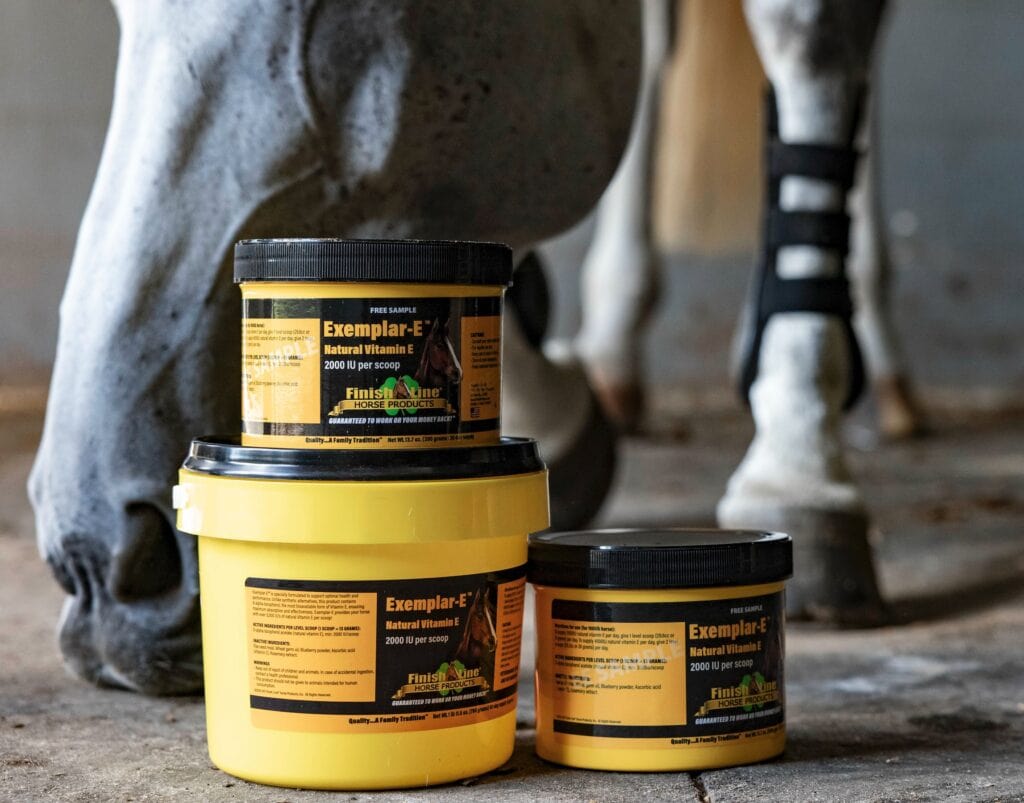 Recognizing the essential benefits of equine Vitamin E, Finish Line Horse Products is now proudly offering our newest product, Exemplar-E. Developed over a two-year period with the help of veterinarians, trainers, and our expert team, Exemplar-E is a daily flaxseed-based supplement containing 2,000IU per scoop of natural vitamin E.