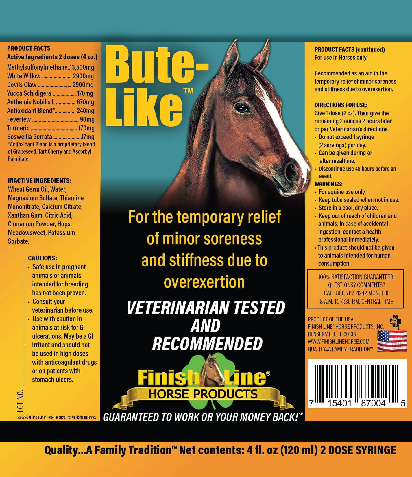 Your horse’s comfort matters. If you are looking for a natural and gentle way to support your horse during times of discomfort, Bute-Like™ syringe offers a convenient and concentrated paste that your horse will love. Comprised of the highest quality ingredients, Bute-Like™ contains ingredients like MSM, white willow, devils claw, kava kava, yucca schidigera, feverfew, turmeric, boswellia serrata, and more for the temporary relief of minor stiffness and soreness due to overexertion.