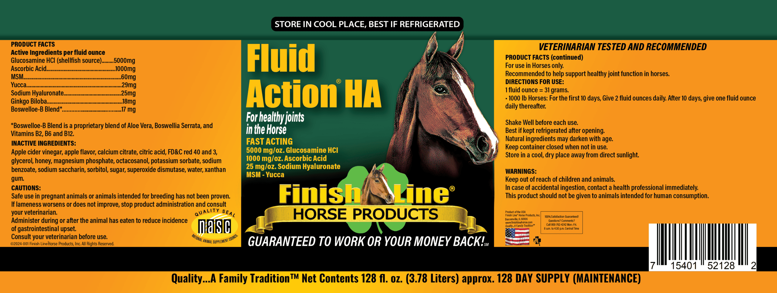 Fluid Action® HA liquid contains functionally high levels of the most recognizable joint health ingredients like Glucosamine, 5000mg/oz, Vitamin C, 1000mg/oz, MSM, 60mg/oz, Yucca, 29mg/oz, Sodium Hyaluronate 25mg/oz, and Ginkgo Biloba, 18mg/oz. Fluid Action® HA also contains B vitamins and antioxidants to provide your horse with maximum support for healthy joints.