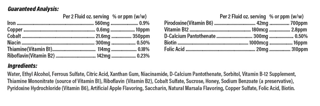 For anemic horses, feed 4 fl. oz. daily for 15 days, then 2 fl. oz. daily. Do not exceed 2 fl. oz. daily in horses engaged in competition or racing.