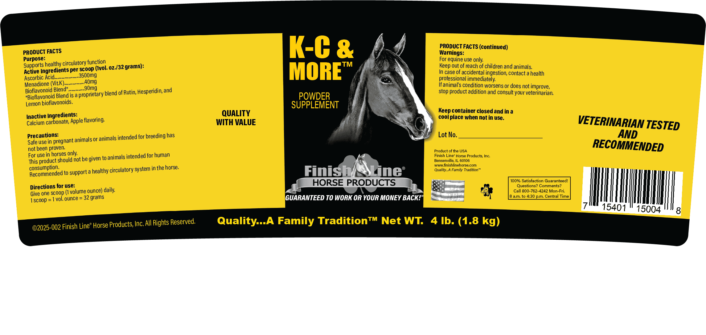Finish Line®’s K-C & More™ is the best way to add Vitamins K and C to your horse’s diet! K-C & More™ helps promote healthy capillary strength in the horse. This product contains 3,500 mg/oz of ascorbic acid and 40 mg/oz of Vitamin K. Other ingredients include rutin, hesperidin, lemon bioflavonoids, and our unique apple flavor.