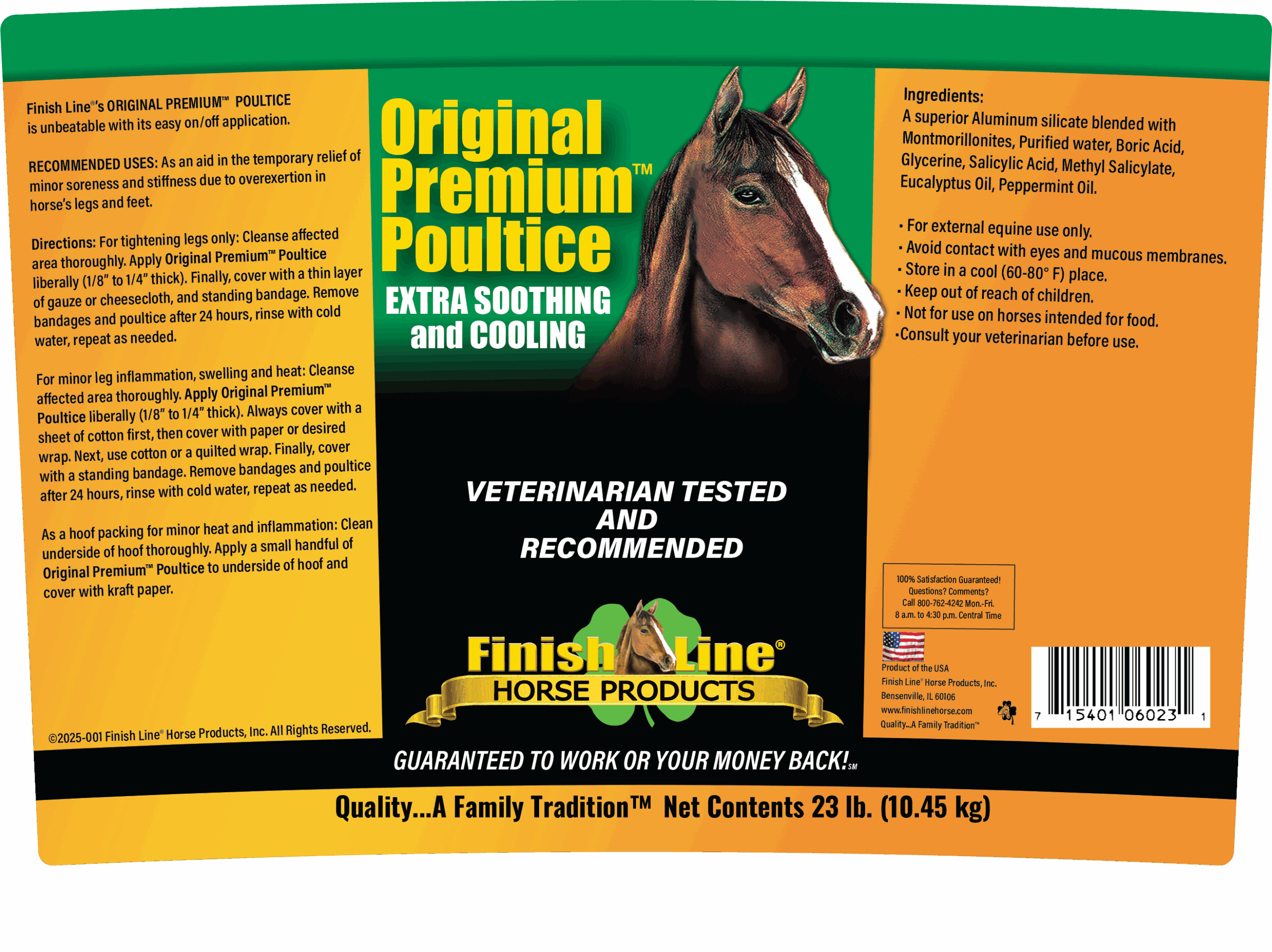 Original Premium™ Poultice was Finish Line®’s first product developed when the company was founded in 1975. Since this time, Original Premium™ Poultice has become one of the best selling poultices in the USA and has become a top choice for hall of fame trainers and Olympic riders worldwide. Original Premium™ Poultice is known for its easy application, reliable consistency, and highly effective action in cooling and tightening the legs after exercise.