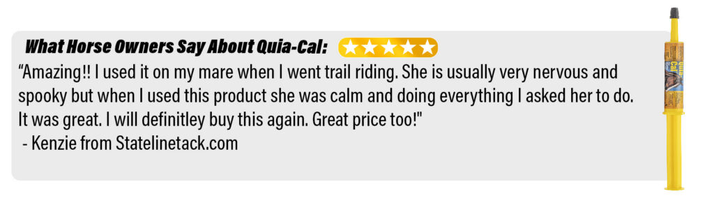 We received a free sample of your product and finally had the opportunity to use it this past weekend (05/02/2020). I gave my Hateful Red mare half of the recommended dose and WOW! Impressive! I’ve tried several calming supplements to make her less aggressive towards other horses on the trail and in the ring, but NOTHING has worked like Quia-Cal. ShiAnne paid attention and completely focused on me and everything I asked her to do – NOT the other horses around her. I just placed an order for TEN syringes! I might also add – you’ve now sent us three of your products as free samples – we have now added all three to our daily supplement feeding program.
