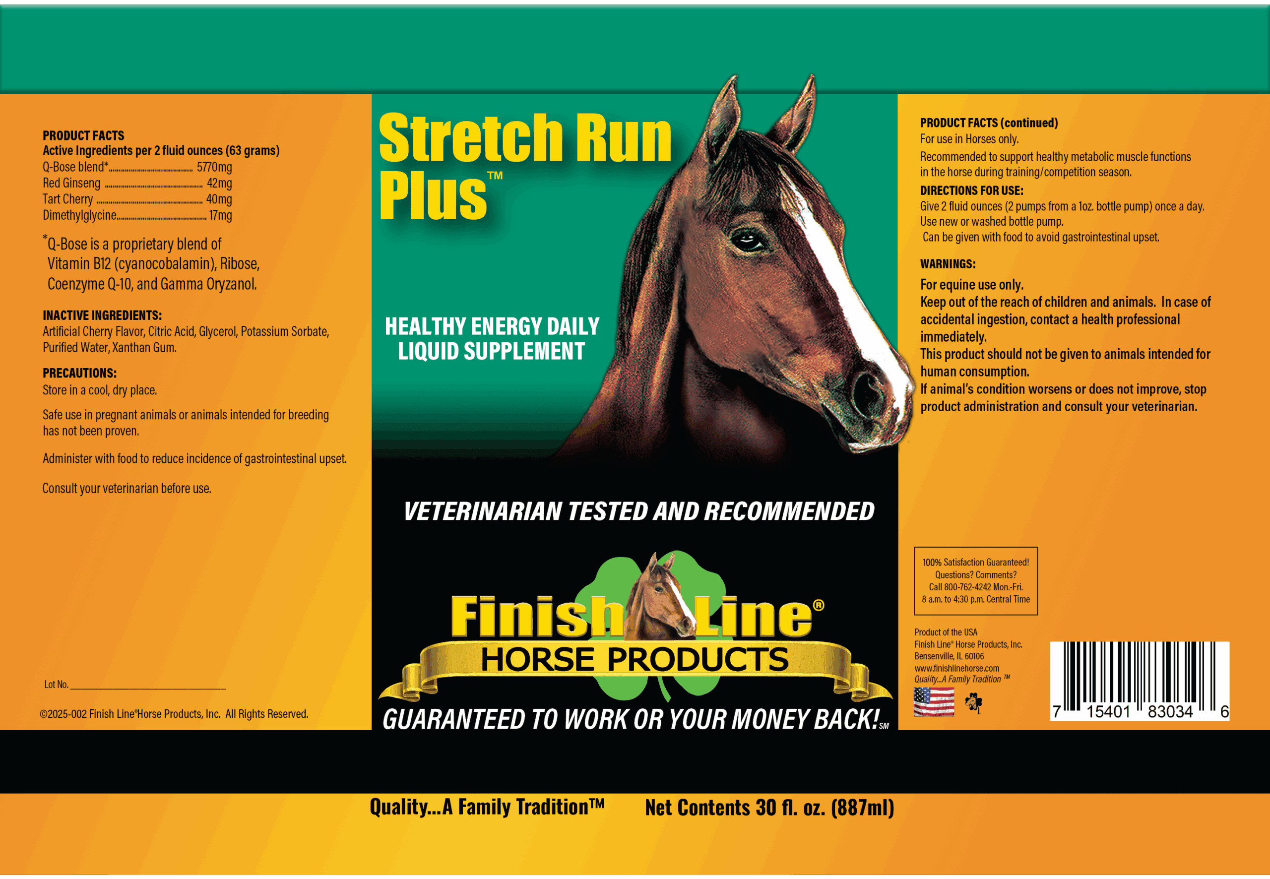 The term “quiet energy recovery” refers to energy restoration without overstimulation. This means a horse will experience sustained performance and steady energy levels. Unlike quick-fix energy sources such as starches, dextrose, sugar, and carbohydrates that can cause spikes and crashes. Stretch Run Plus™ is designed to meet the daily needs of performance horses with added antioxidants providing active horses the cellular fuel they need for sustained performance, rapid recovery, and peak athletic output.