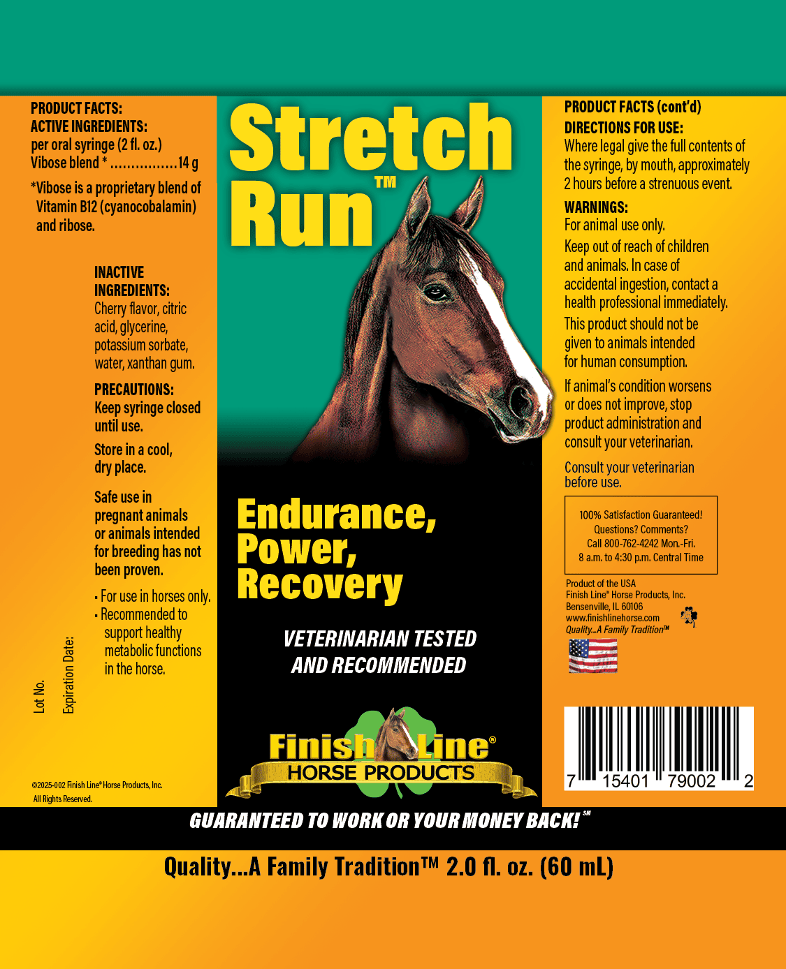 The term “quiet energy recovery” refers to energy restoration without overstimulation. This means a horse will experience sustained performance and steady energy levels. Unlike quick-fix energy sources such as starches, dextrose, sugar, and carbohydrates that can cause spikes and crashes. Stretch Run™ is designed to supply the essential building blocks for energy production, providing active horses the cellular fuel they need for sustained performance, rapid recovery, and peak athletic output.